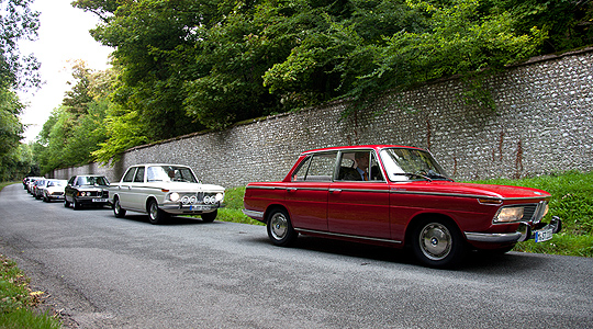 Einer dieser seltenen Tourenwagen stand in diesem Jahr auch beim Goodwood Revival im Starterfeld – mit Vierfach-Tourenwagen-Weltmeister Andy Priaulx und BMW-Vorstandsmitglied Herbert Diess prominent besetzt. Zu seinen Sturm- und Drang-Zeiten war der TI/SA aus der Sammlung von BMW Classic zwischen 1965 und 1966 bei Rundstrecken- und Bergrennen im Einsatz, 1992 gewann Dieter Quester an seinem Steuer die Europameisterschaft für historische Tourenwagen. Nun also die St. Mary’s Trophy in Goodwood. Die Klassik-Abteilung von BMW hat die „Neue Klasse“ aber nicht nur auf die Strecke geschickt – zum 50. Jubiläum der Baureihe stehen uns Journalisten für die Anreise zum Revival auch einige beispielhafte Exemplare der Baureihe bereit. Ein sportlicher BMW 1800 TI, ein BMW 2000 als eines der erfolgreichsten Modelle der Klasse, ein BMW 2000 Tii mit Vierzylinder-Einspritzmotor und 130 PS, ein eher italienisch dimensionierter, von Frua gezeichneter BMW 1600 GT aus Basis des Glas GT Coupé – und ein BMW 1800 TI/SA, der auf den wunderbaren Berg-und-Tal-Landstraßen zwischen Ascot und Goodwood erahnen lässt, welche Freude man an diesem Steuer erst auf einer Rennstrecke haben kann.