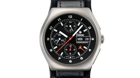 Die von dem Juristen Dr. Ernst Kurtz gegründete Marke schickte einen Automatik-Chronographen mit dem Lémania-Kaliber 5100 ins Rennen um diesen lukrativen Auftrag. Der Zeitmesser beeindruckte die Verantwortlichen auch durch seine neuartigen Drücker, die Tutima hatte großflächige, ins Gehäuse integrierte Tasten gewählt. Diese aufwändige Lösung erleichtert die Bedienung ganz erheblich. Zudem kann das, was nicht hervorsteht, in turbulenten Situationen oder bei Unachtsamkeit auch nicht abbrechen. Schließlich erhielt die Marke den Auftrag, deren Name sich passenderweise vom lateinischem „tutus“, welches sicher und geschützt bedeutet.